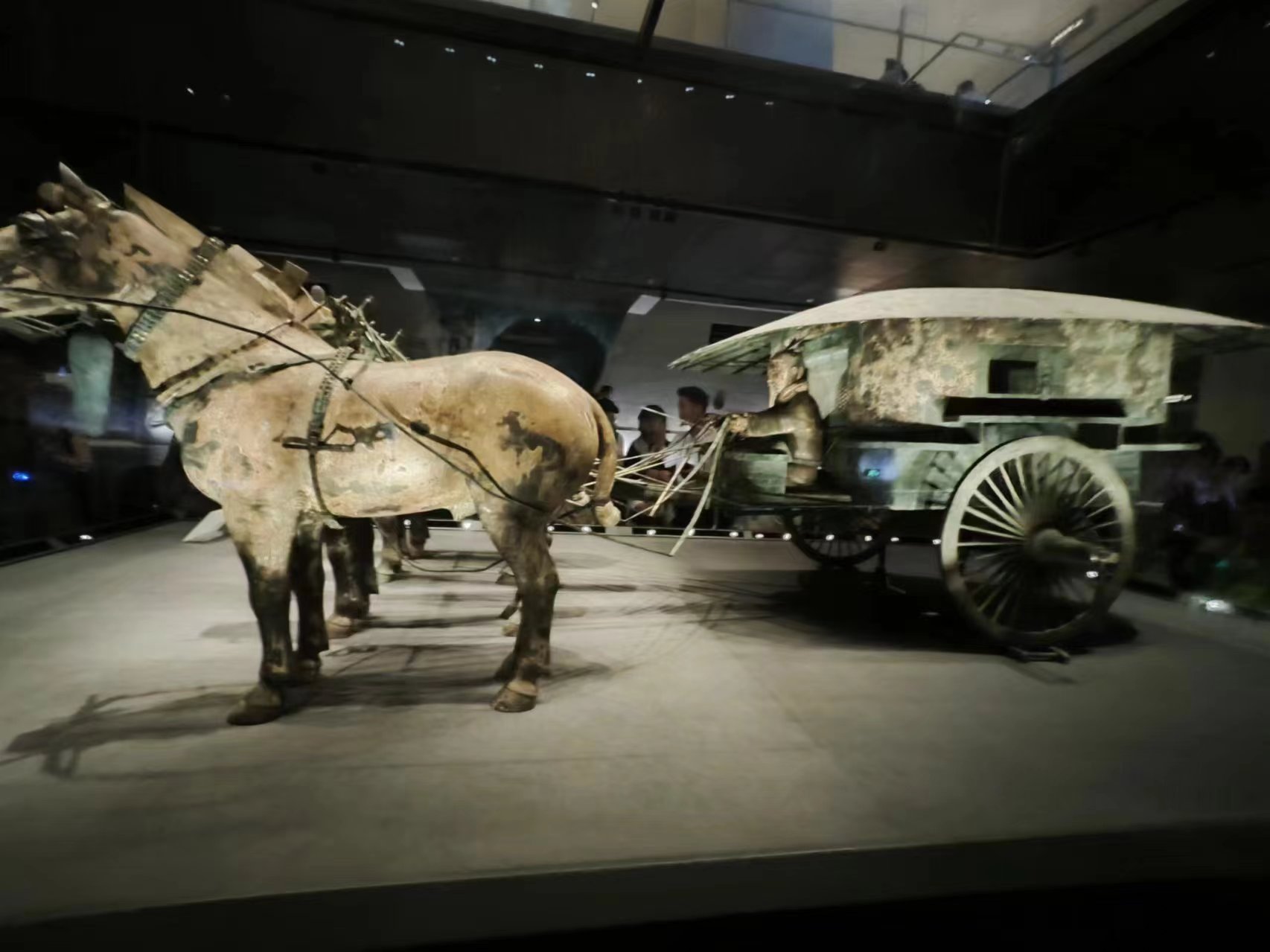 我们进入了铜车马博物馆。首先是序厅,它展示了铜车马的重要地位、历史背景等一些关于铜车马的概况信息。然后最激动人心的时刻到了。我们来到了第一展厅,也就是展示铜车马的展厅。在历史的幽光中,秦陵铜车马静静伫立。驷马昂首,似仍蓄着千年前的风发意气;车厢古朴,仿佛藏着往昔的岁月秘语。驭手身姿沉稳,仿佛还握着那穿越时空的缰绳。这不仅是精湛工艺的凝萃,更是大秦帝国辉煌的永恒剪影,让我们得以窥见古老文明的深邃与壮丽。